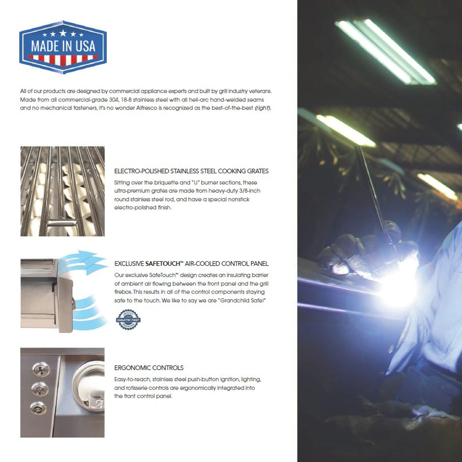 - Exclusive Safe Touch and Hood-Assist Alfresco’s signature air-cooling system keeps the front control panel and bullnose cool to the touch as well as protects all the electronics. The EZ-Lift hood design allows for easy hood lifting and closing while you cook.