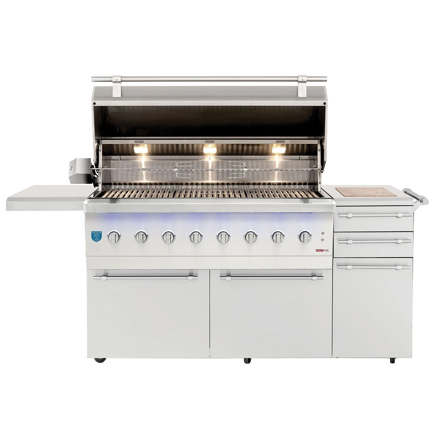 The 54-inch Encore also features a unique Flame Thrower Ignition that shoots a burst of flame to ignite the main burners and is much more reliable than traditional spark ignition systems. The double lined, spring assisted hood keeps hot air in to ensure a consistent grilling environment complete with a built in 3-inch temperature gauge and interior halogen lighting with LED front panel lighting. Available for both propane and natural gas, this built in grill ensures a complete outdoor kitchen.