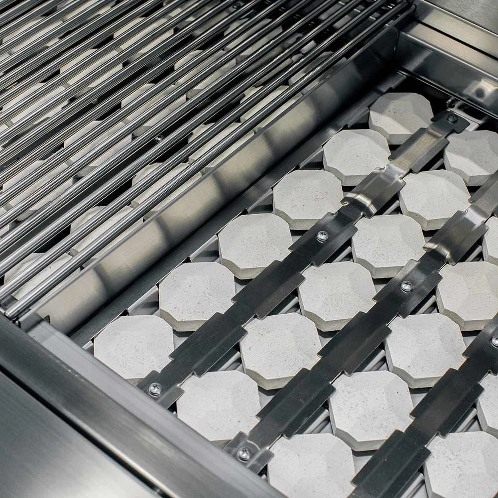 - Captured Briquette Trays – Unique ceramic briquettes sit above the burner to provide radiant heat and eliminate hot/cold zones across the 855in² cooking surface