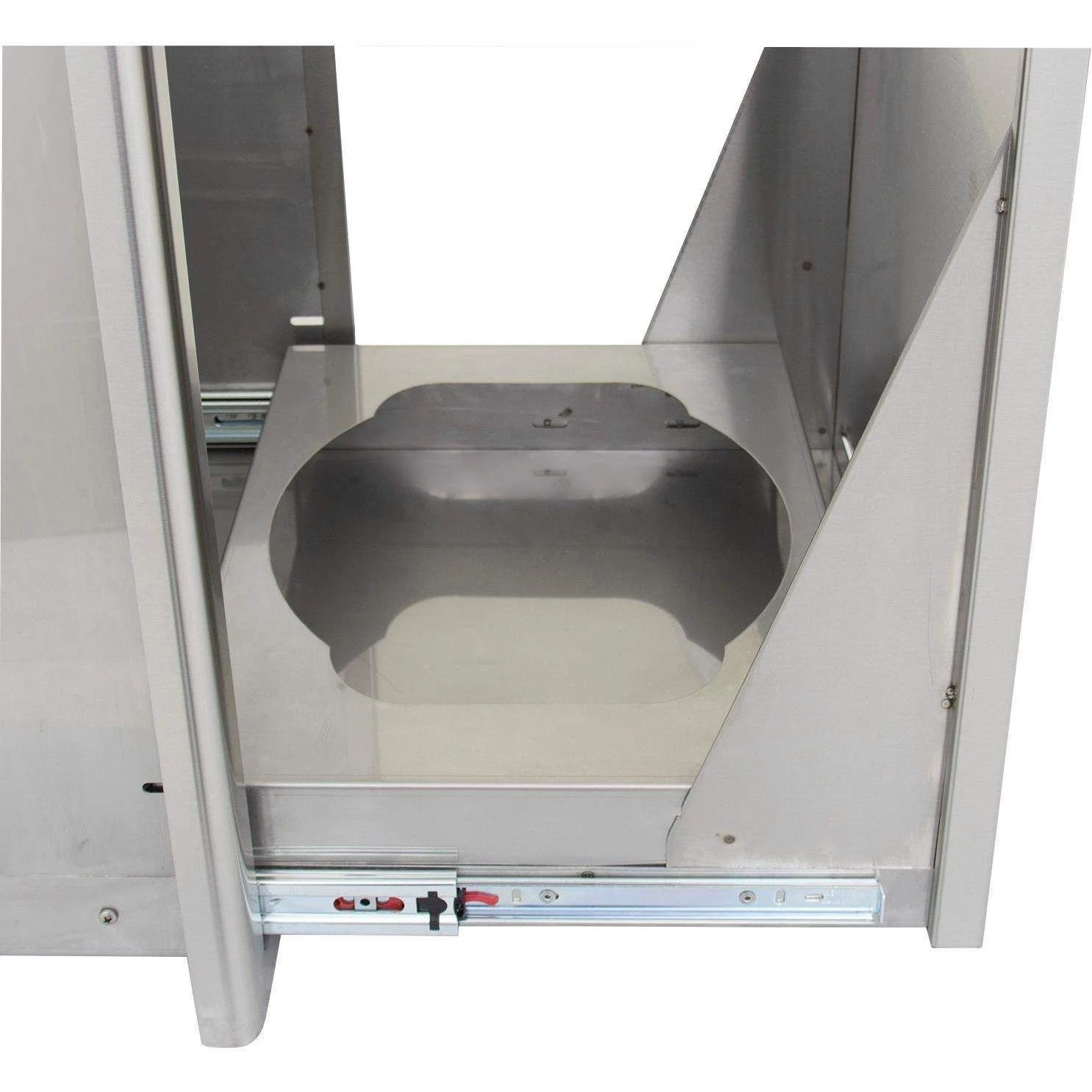- Trash/LP Tank Drawer – Roll-out drawer stores a standard 20 lb. propane tank or kitchen-sized trash can