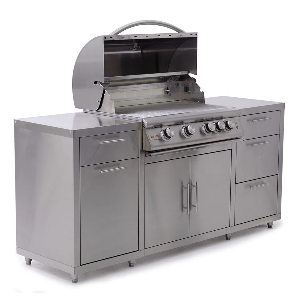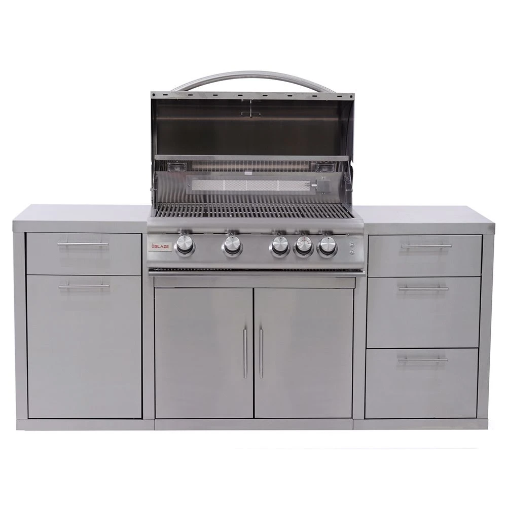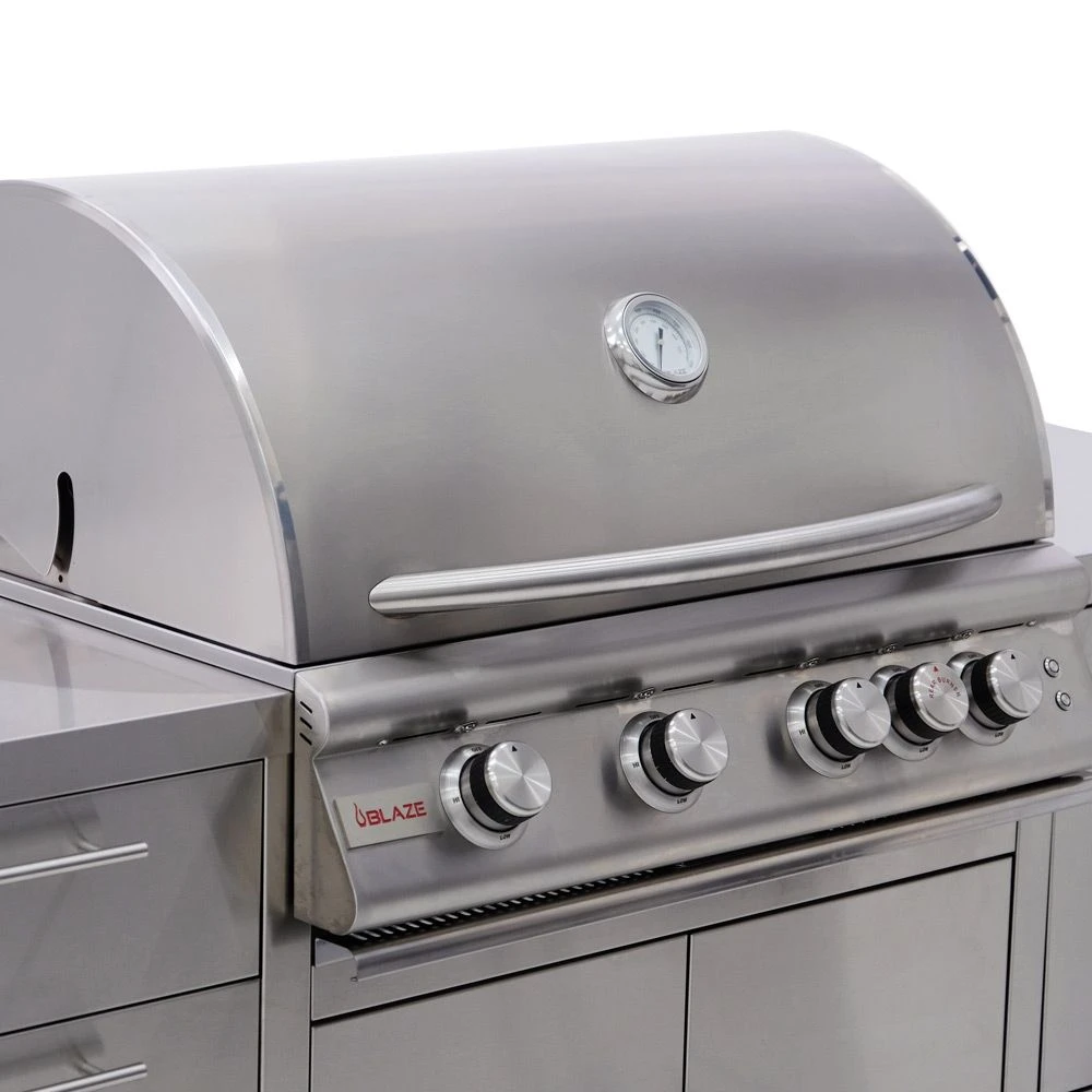 Blaze Freestanding Gas Grill with Lights on Island, 32-Inch provides a high performing luxury grill at an affordable price paired with a spacious and convenient grill island that’s easy to assemble. The heavy duty 304 stainless steel construction throughout the grill body ensures a long-lasting and durable appliance while the impressive cast stainless steel burners offer a commercial quality burner that’s normally found on more expensive grills. The integrated heat zone separators allow you to create distinct grilling zones for direct/indirect grilling that’s perfect for everything from steak to ribs while the perforated flame stabilizing grids do a great job to reduce flare-ups. The included infrared rear burner is rated for 10,000 BTU to provide a wealth of heat for low, slow rotisserie cooking using the optional rotisserie kit (not included) while the integrated interior grill lights illuminate the grill surface for day or night grilling.