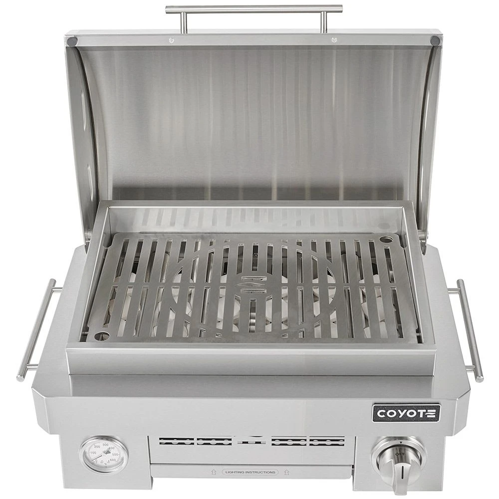 Coyote Stainless Steel Portable Grill, Propane (C1PORTLP) provides a premium portable grilling option. With a 200-square-inch cooking surface and the Coyote Signature Grate design, this grill delivers a high quality cooking experience in a convenient design. The Coyote Portable Grill also features 316 marine grade stainless steel construction for superior durability. Under the hood, the grill’s Coyote Infinity burner delivers 20,000 BTU and a maximum temperature of 700 degrees Fahrenheit, while the ceramic heat control grid delivers impressive results every time you cook. For added convenience, this grill can be used with either a 20-pound standard grill propane tank or a small propane cannister (adapter included).