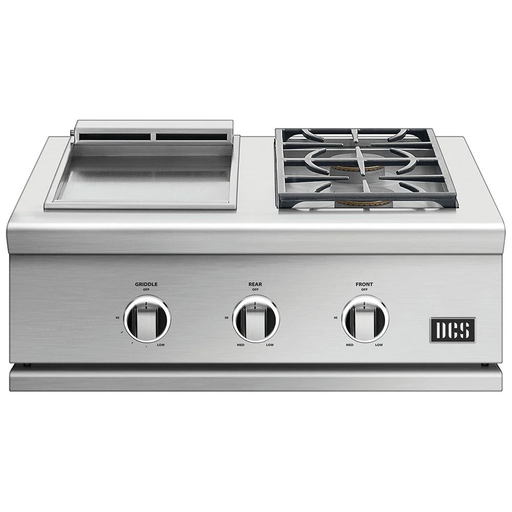 DCS GDSBE1-302 Series 9 30-Inch Built-In Double Side Burner and Griddle Combo provides a high-end griddle and side burner to help complete your ultimate outdoor kitchen. Featuring complete 304 stainless steel construction, this unit offers long-lasting durability for many years of premium grilling. This combination appliance combines the convenience of a griddle with the versatility of dual side burners for a useful outdoor kitchen device capable of performing a wide variety of cooking functions. A fast and weather-resistant ignition increases reliability, while illuminated dials match the suite of DCS Series 9 products for a uniform design to complete your outdoor kitchen setup.