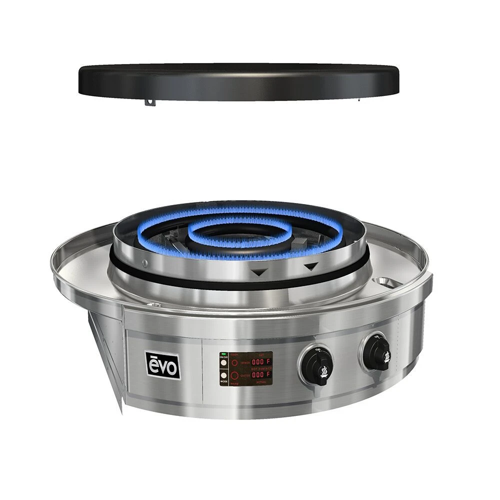 The integrated stainless steel drip pan surrounds the cooking surface to manage and contain spillovers, while the spillover trays located behind the right and left side of the control knobs are removable and dishwasher safe to provide a convenient and efficient cleanup. The electronic starter is located just under the burners to provide simultaneous one-touch ignition for both burners. Take your cooking to a new level with help from Evo.