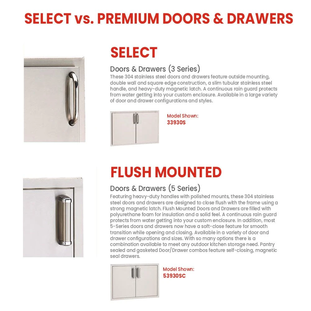This grill island package comes with a choice between two access door/drawer options: Premium and Select. Fire Magic Premium is the high-end choice, offering top-of-the-line materials and superb craftsmanship. These doors and drawers are built to impress with their durability and sleek finish. They feature heavy-gauge stainless steel construction, ensuring they can withstand the elements. Premium series also include soft-close mechanisms, stylish handles and polished edges, giving your outdoor kitchen a luxurious touch. Fire Magic Select provides a more affordable alternative without sacrificing quality. While still maintaining durability, Select doors and drawers have a slightly simpler design and construction compared to the Premium series. They’re crafted with stainless steel but at a lighter gauge. Even though they don’t have all the bells and whistles, they offer reliable functionality and a modern aesthetic. Select series ensures your outdoor kitchen stays stylish while providing ample storage space.