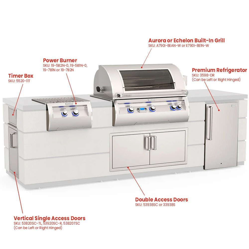 - Grill, power burner, refrigerator, double access doors and choice of side access door or pull-out trash drawer