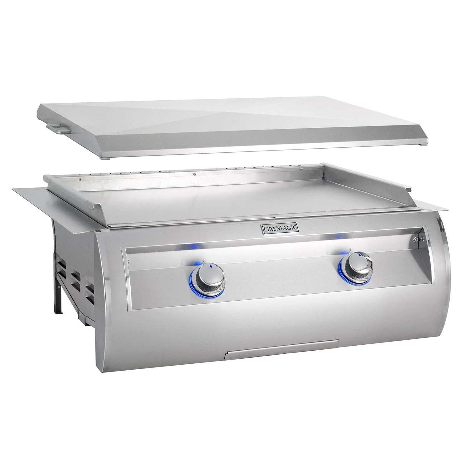 Fire Magic Echelon Gourmet Built-In Griddle provides a premium built-in gas griddle option to enhance the grilling capabilities of your outdoor kitchen paradise. The Gourmet Griddle boasts a 3/8-inch thick stainless steel, warp-free griddle surface and a 30 x 18-inch cooking area that’s perfect for cooking anything from fried rice to bacon and eggs. The dual stainless steel burners work together to provide a 40,000 BTU capability while the hot surface ignition and two back-lit burner control knobs provide independent, two-zone cooking. This unit comes with the same cut-out dimensions as the Fire Magic E660i grill to allow more versatility within your outdoor kitchen. The easy cleaning grease tray has two removable collection troughs and the elegant stainless steel griddle cover will keep your griddle surface protected from the elements when not in use. Expand your outdoor cooking possibilities with the Echelon Built-In Gourmet Griddle from Fire Magic.