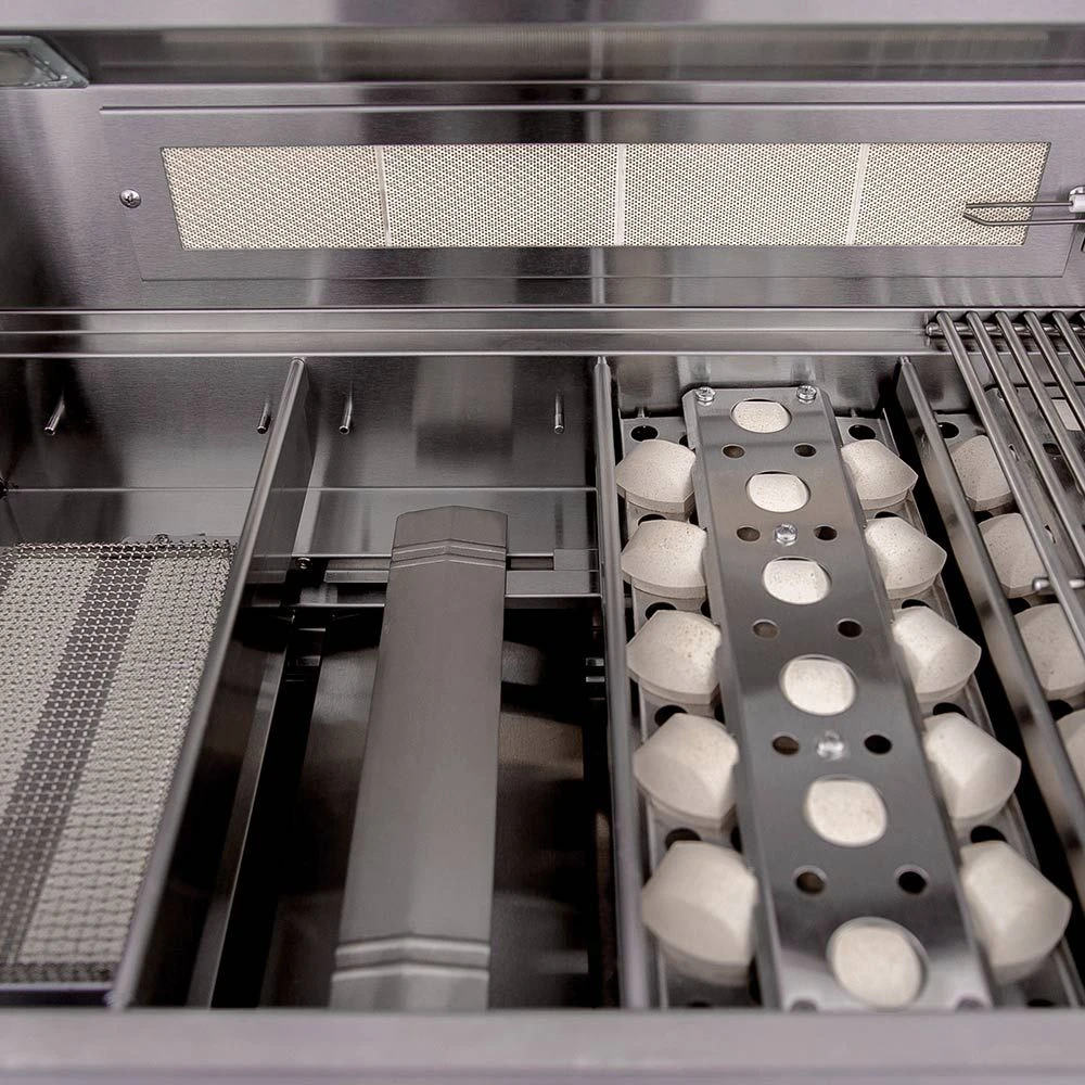 - Captured Briquette Trays – Unique ceramic briquettes sit above the burner to provide radiant heat and eliminate hot/cold zones across the 875in² cooking surface