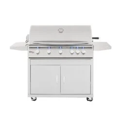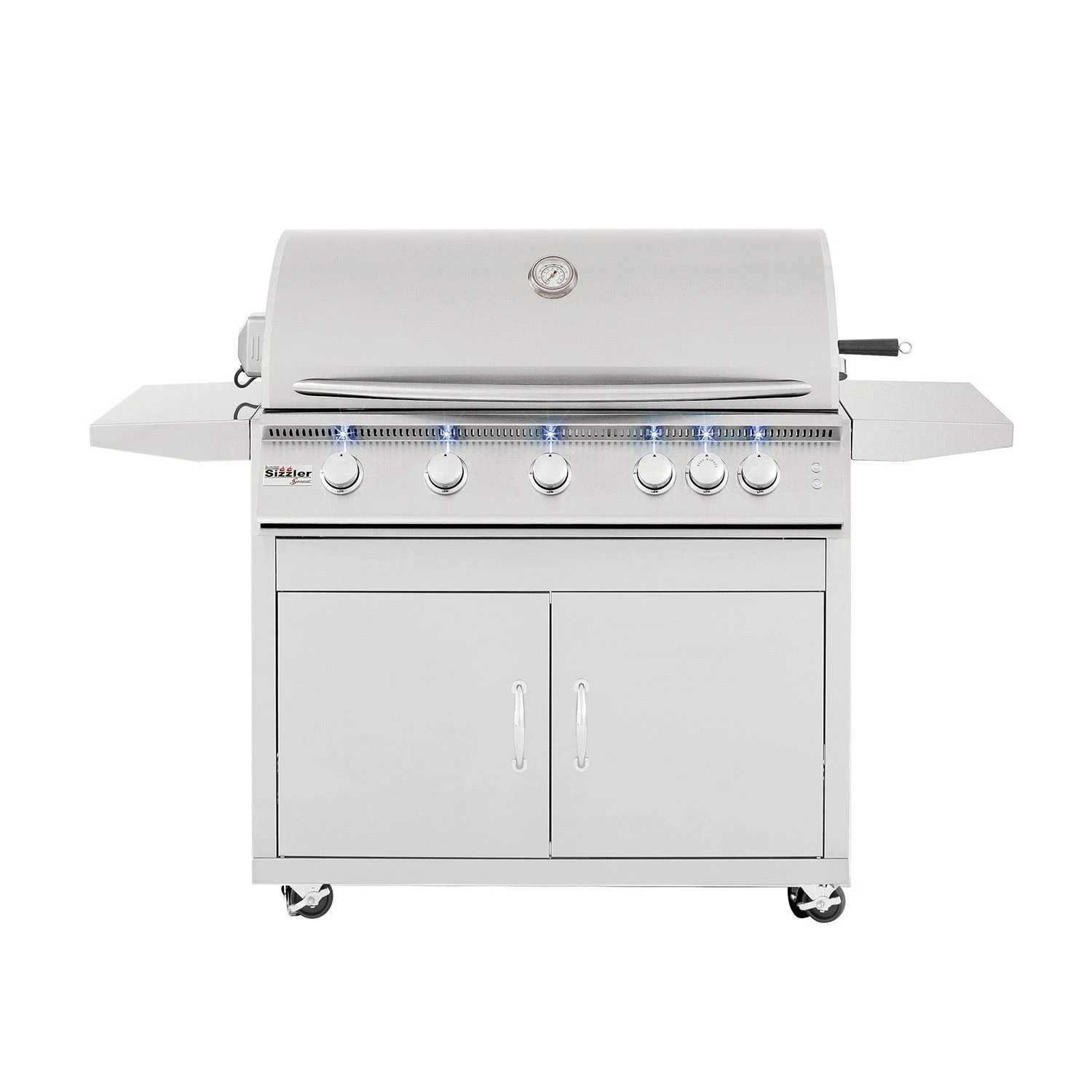 The 40-inch Sizzler Pro offers a signature Flame Thrower Ignition that uses a burst of flame to ignite the main burners more reliably than a traditional spark system. The hood is fitted with a temperature gauge for easy monitoring and is built in a two-layer, insulated style to keep heat where it belongs, giving you a consistent cooking environment. Interior lights and LED enhancements offer exceptional ease of use in low-light conditions. As an added perk, it features a 15,000 BTU infrared back burner for professional-quality rotisserie cooking. The ready-to-assemble stainless steel grill cart offers double door storage, fixed shelves, and high quality locking casters to provide a terrific standalone grill option.