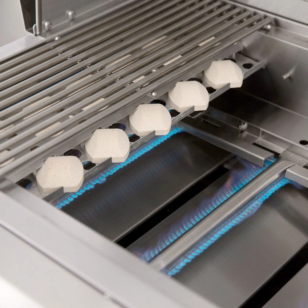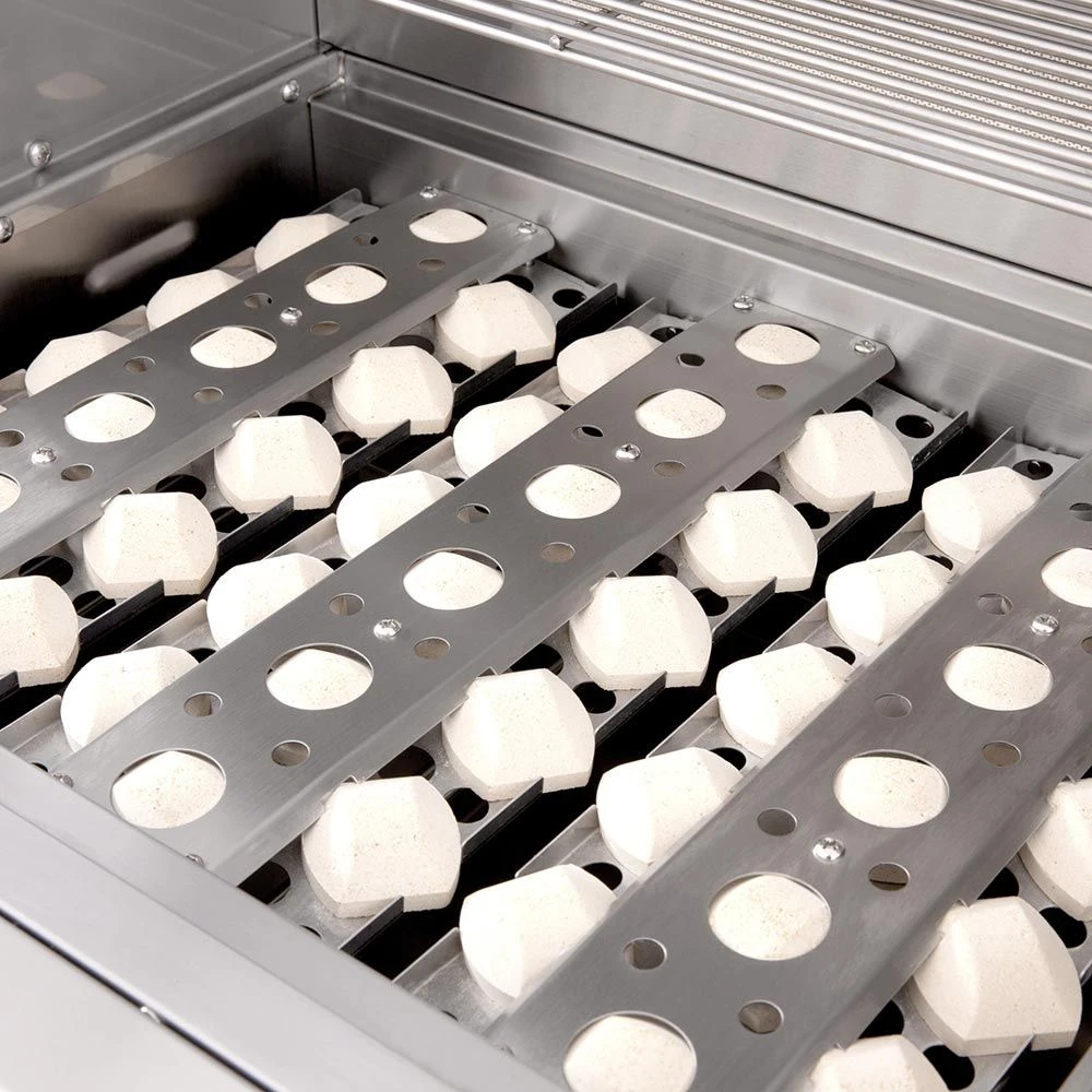 - Captured Briquette Trays – Unique ceramic briquettes sit above the burner to provide radiant heat and eliminate hot/cold zones across the 875in² cooking surface