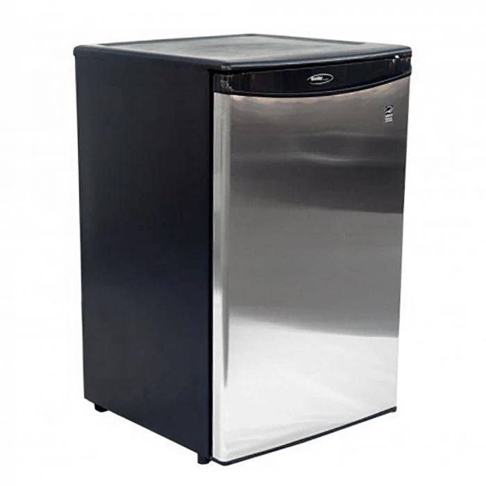 The Outdoor GreatRoom Company DAR044A5BSLDD Danby Stainless Steel Refrigerator, 21×33.5-Inch provides a premium compact refrigerator for your kitchen. With 4.4 cubic feet of storage and cooling space, this refrigerator offers ample storage for prep ingredients or leftovers after a barbecue. Two full shelves offer storage versatility, while an additional half shelf and vegetable crisper offer even more storage options. The automatic defrost system offers simple cleaning and maintenance, while the spotless-steel finish offers an authentic stainless steel appearance without fingerprints. Additional features include interior lighting, a scratch-resistant worktop, and a reversible door hinge to round out an impressive package for your kitchen space.