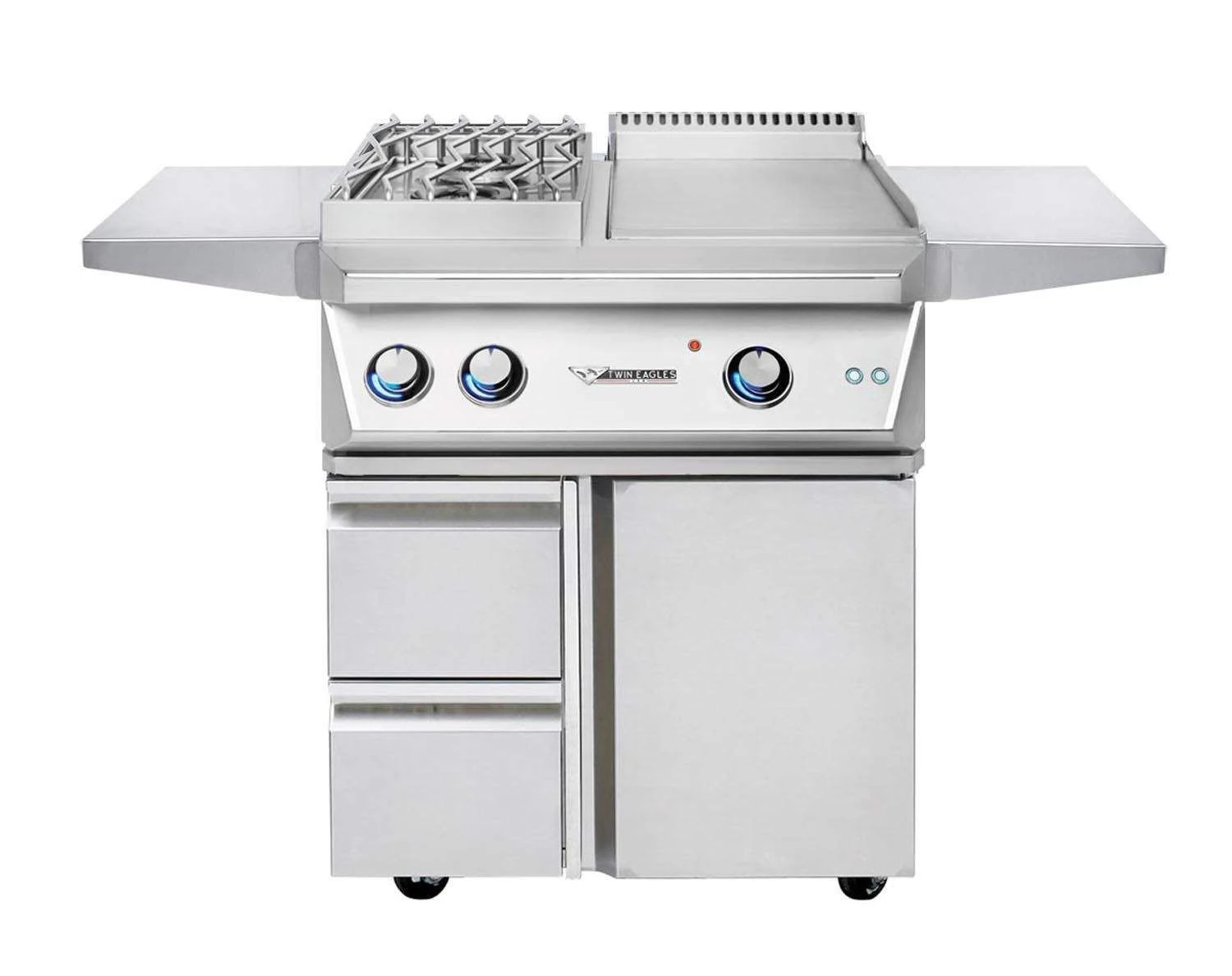 Twin Eagles TEBC30-C 30 Inch Dine And Breakfast Club On Cart With Drawers And Door provides a versatile companion to your grill to help complete your outdoor kitchen. The solid 1/4-inch thick stainless steel griddle compliments the (2) European sealed side burners with stainless steel “S” grates. Cater to any cooking needs when you add the Dine & Breakfast Club to your outdoor kitchen and enjoy the ability to perform tasks such as boiling a pot of water on the burners, sauteing vegetables on the griddle, and many more options. A matching cart with drawers and a door offers an added level of convenience with additional storage or space for a propane tank.